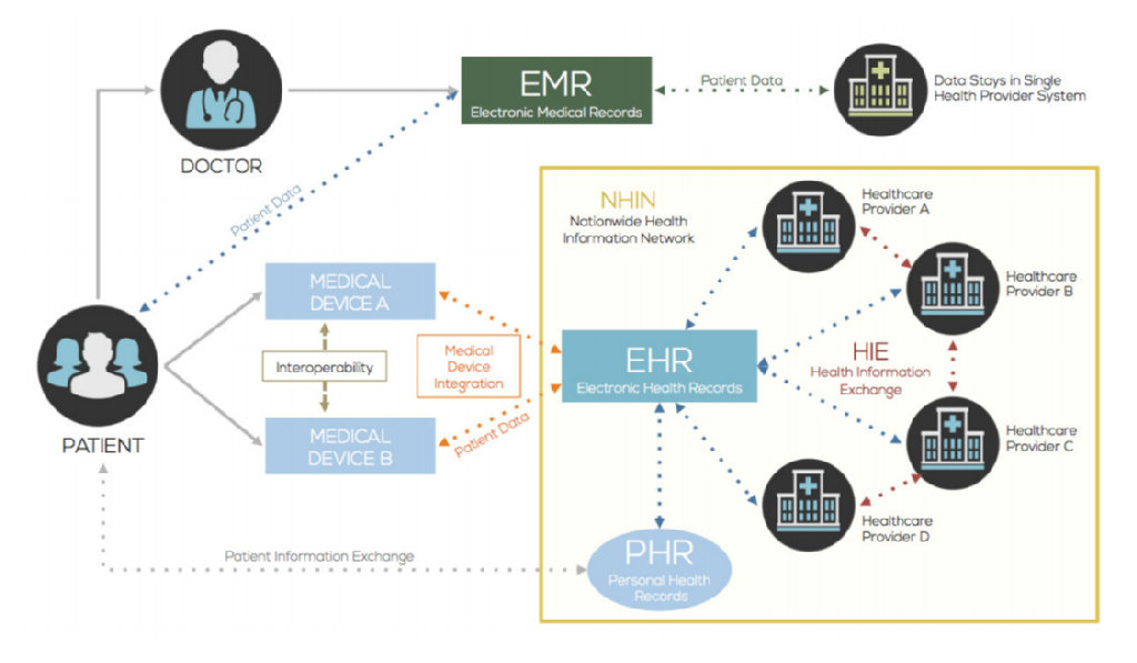 تعد الحاجة المتزايدة للتشغيل البيني للأجهزة الطبية أحد العوامل العديدة التي تضغط على مقدمي الرعاية الصحية والمؤسسات لتبني أنظمة تكنولوجيا المعلومات الصحية القائمة على التخزين السحابى لتلبية احتياجات الرعاية الجيدة. تقوم الأجهزة الطبية الإلكترونية بتعقب بيانات المرضى التي يتم تسجيلها يدويًا أو تلقائيًا في السجلات الصحية الإلكترونية (EHRs) من خلال عملية تعرف باسم تكامل الأجهزة الطبية. تسمح سجلات الصحة الإلكترونية بتبادل بيانات المريض من مزود إلى مزود عبر تبادل المعلومات الصحية في شبكة المعلومات الصحية على مستوى البلد. يمكن للمرضى الوصول إلى المعلومات الصحية المسجلة من قبل أطبائهم أو أطبائهم أو الأجهزة الطبية الإلكترونية من خلال ما يعرف بالسجل الصحي الشخصي (PHR).